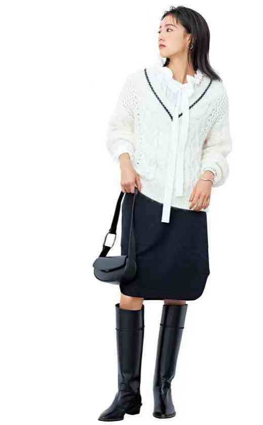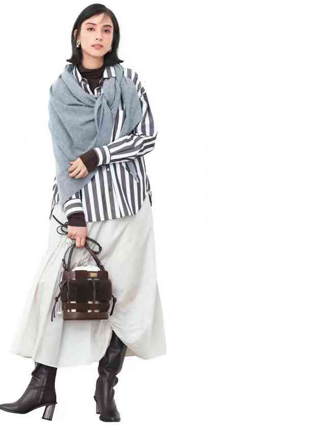 搭配半身裙與長(zhǎng)筒靴,同色包包點(diǎn)綴,整個(gè)配色太和諧了。