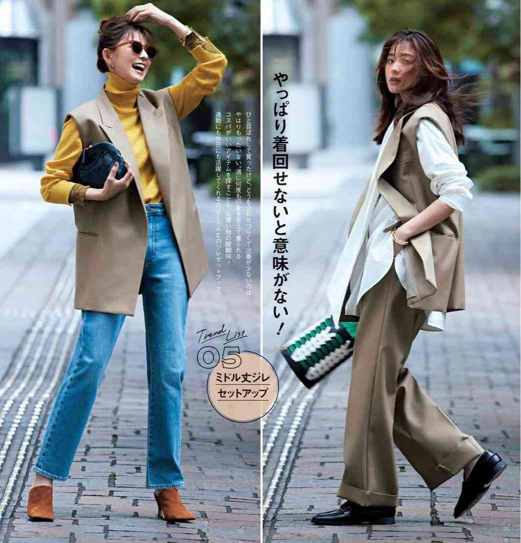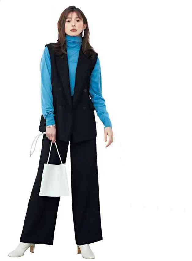 西裝馬甲套裝,一般以褲套裝、裙套裝出現(xiàn)。褲子利落、裙子優(yōu)雅,坐實(shí)2種風(fēng)格穿搭。比如,沉穩(wěn)黑色馬甲褲套裝,內(nèi)搭藍(lán)色高領(lǐng)衫,撞色驚艷。