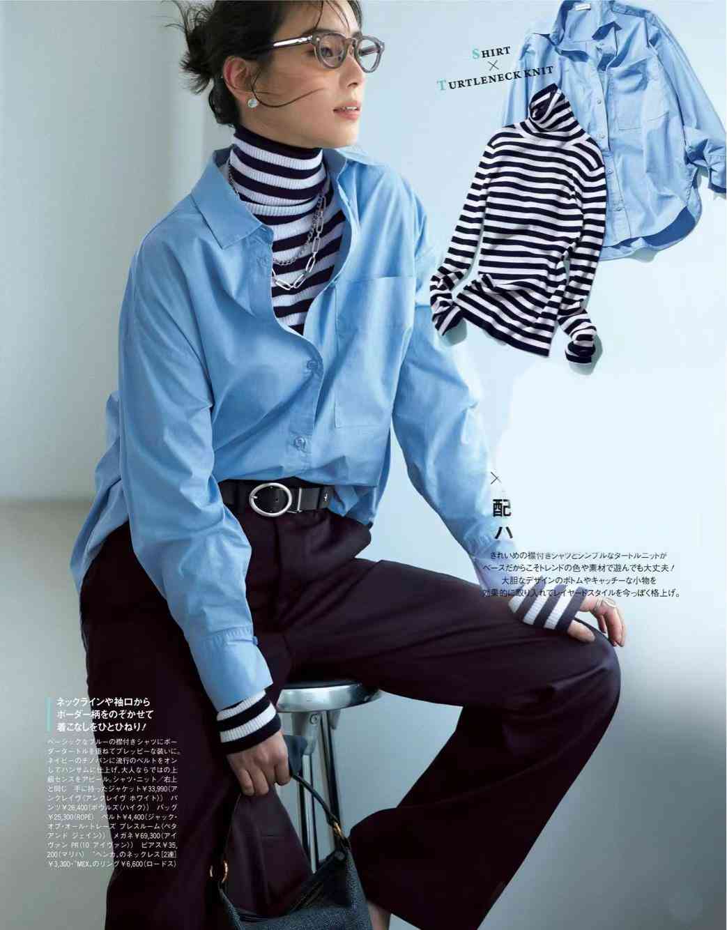 經(jīng)典帥氣的藍(lán)襯衫,自帶出場(chǎng)bgm光環(huán)。內(nèi)搭條紋針織高領(lǐng)衫,用同樣的經(jīng)典與個(gè)性分擔(dān)其焦點(diǎn),黑、白、藍(lán)三色,倜儻有型,不失柔和。
