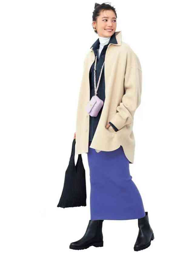 搭配米色休閑外套,配一條紫色半身裙和短靴,颯美兼具。