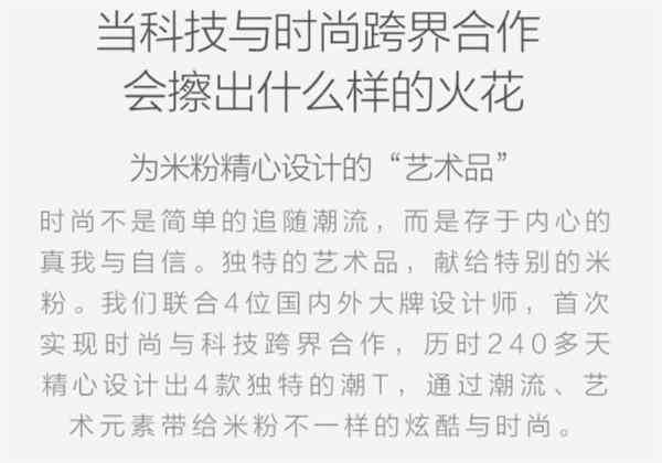 近日,小米眾籌就上架了這樣一套T恤,名為“COTTONSMITH設(shè)計(jì)師聯(lián)名合作款T恤”,聯(lián)合4位國(guó)內(nèi)外大牌設(shè)計(jì)師,首次實(shí)現(xiàn)時(shí)尚與科技跨界合作,歷時(shí)240多天精心設(shè)計(jì)出4款獨(dú)特的潮T恤,號(hào)稱為米粉精心設(shè)計(jì)的“藝術(shù)品”。