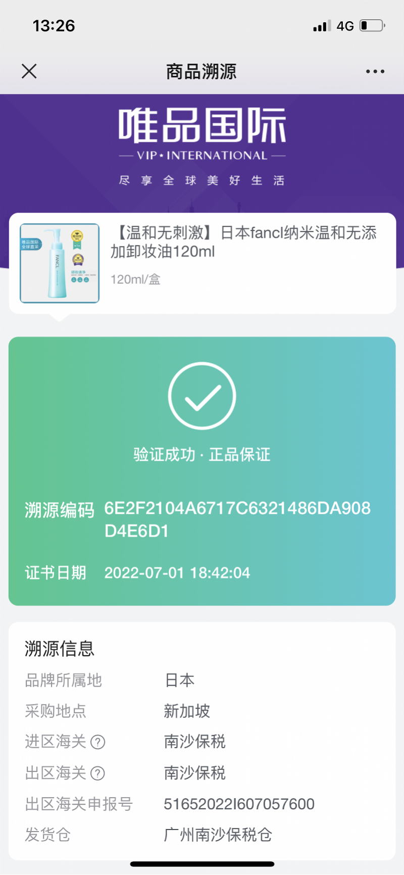唯品會顯示在購買海淘產(chǎn)品Fancl卸妝油之后,找溯源二維碼、輸入刮開可見的六位溯源碼之后,可以看到相關(guān)商品是從新加坡采購、并經(jīng)南沙保稅倉入境的。