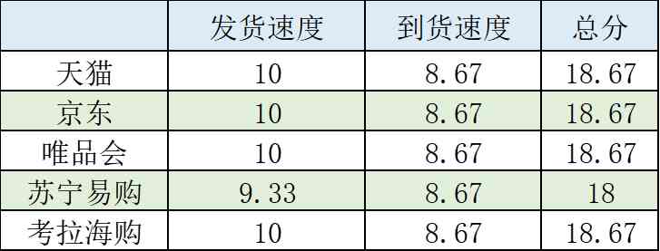 其中,歐萊雅、薇諾娜屬于平臺自營非海淘商品,F(xiàn)ancl屬于海淘商品,由平臺有“國際”字眼店鋪發(fā)貨。測評結(jié)果顯示,發(fā)貨速度方面,四大平臺對海淘和非海淘商品均為當天發(fā)貨,只有京東的海淘商品Fancl卸妝油、蘇寧易購平臺的Fancl商品與歐萊雅商品當日下單,次日發(fā)貨。
