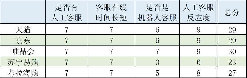 總評分顯示,天貓、京東、唯品會平臺并列綜合排名.,蘇寧易購平臺在五家測評的平臺中排名最后。售前信息維度中,天貓和京東表現(xiàn)較好,考拉海購得分較低。售后服務(wù)維度中,各平臺差距不大,蘇寧易購排名最后??头S度中,唯品會表現(xiàn)最佳,蘇寧易購墊底。