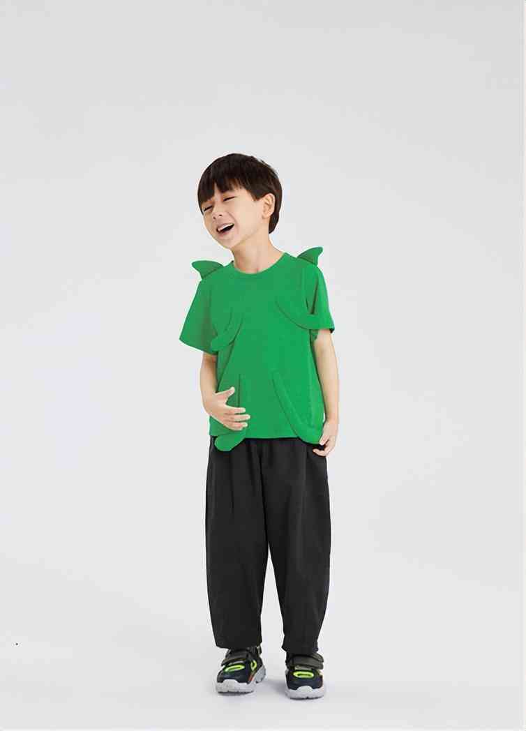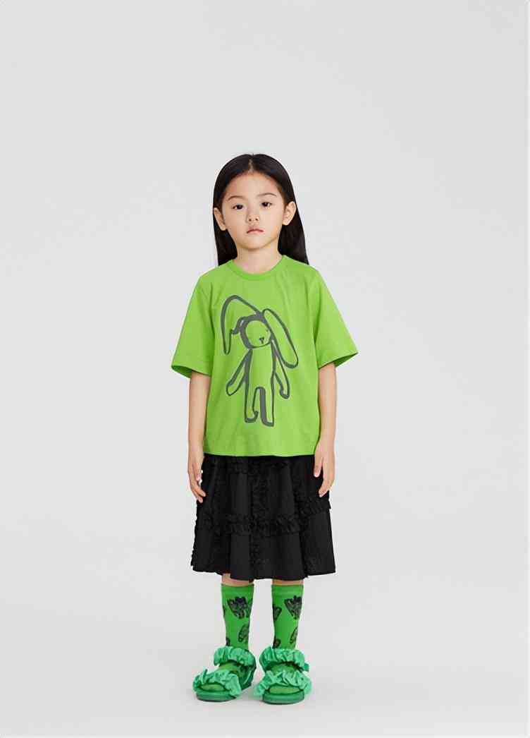 在小孩子們的世界里,他們有著無(wú)止境的勇氣和能量,一切事物都是他們的朋友,為了滿足童心,設(shè)計(jì)師們?cè)谝路D案的設(shè)計(jì)上特意使用了擬人的手法,塑造出了兩只形象生動(dòng)的兔子,一只是愛美的珍珠兔,兩只大大的耳朵夸張可愛,深得小朋友們的喜愛;另一只是異形兔子,T恤版型寬松簡(jiǎn)約,穿上身舒適感很強(qiáng),小孩子們就像被異形兔子擁入懷中一樣,通過方法的視覺沖擊呈現(xiàn)出神奇動(dòng)物自帶的可愛俏皮感,呈現(xiàn)出錯(cuò)落有致的層次感,立體感和線條感更強(qiáng),打破了傳統(tǒng)常規(guī)的T恤版型,整體效果更好。
