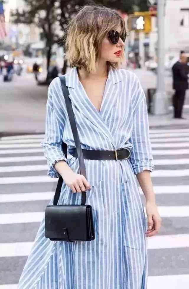條紋襯衫裙,輕松休閑的同時(shí),骨子里自帶一份職場(chǎng)的利落與率性。一條腰帶讓它在灑脫與精致之間切換自如,毫無(wú)違和感。
