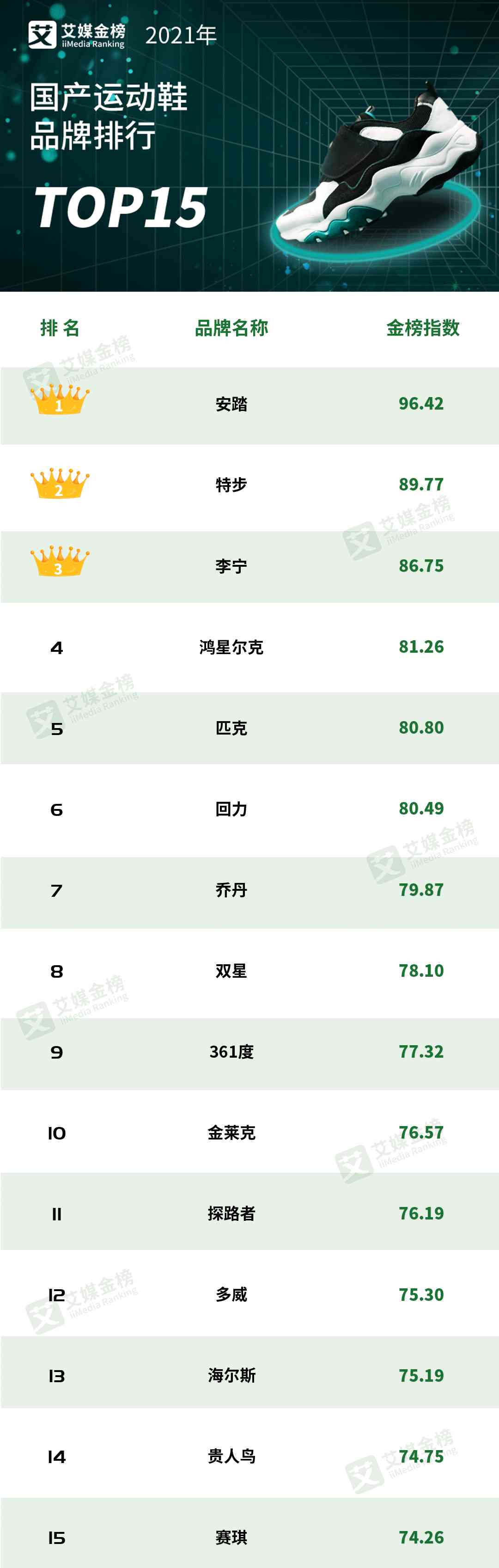 下面我們就根據(jù)艾媒金榜.發(fā)布的《2021年國產(chǎn)運(yùn)動鞋品牌排行Top15》,簡單介紹一下頭部品牌。前五名福建晉江品牌占據(jù)4席。
