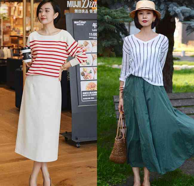 夏季用一件條紋體恤就能進(jìn)行一萬(wàn)種穿衣搭配,沒有復(fù)雜感。無(wú)論是直筒裙或者大擺裙,都給人一種清新恬靜的感覺!