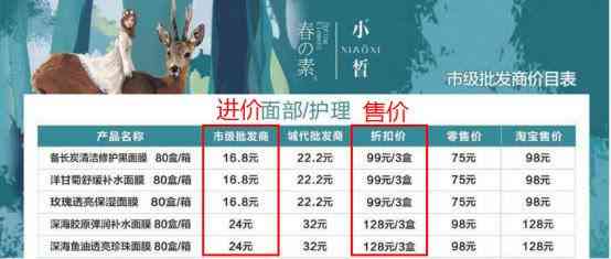 據(jù)為一款名為“春素小皙”的面膜作城市代理的微商A描述,他們的主要盈利方式是賺差價。這款面膜對外零售價75元一盒,折扣價99元3盒。如一次性投入1000元成為最底層的城縣級代理,就能以22.2元的價格拿貨,賺取每盒近11元的價差。算下來,利潤率(利潤÷成本×100%)高達(dá)50%。