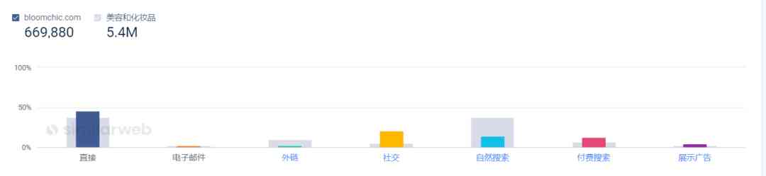 在所有渠道中,BloomChic的直接訪問(wèn)占比達(dá)45.47%,證明品牌的直接受眾高,愿意直接搜索網(wǎng)站域名??梢?,一個(gè)簡(jiǎn)潔易記、彰顯品牌特色的域名可以替網(wǎng)站加不少分,因此,在選擇網(wǎng)址時(shí),域名要設(shè)置得相對(duì)較短且簡(jiǎn)單易記,必須包含品牌名,避免累贅信息。