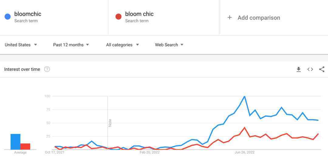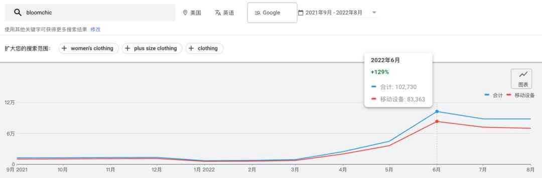 以bloomchic.com為例,該域名就包含了品牌名,并且根據(jù)谷歌趨勢(shì),可以發(fā)現(xiàn)“bloomchic”的搜索趨勢(shì)不斷上漲,通過(guò)品牌詞流量可以側(cè)面反映品牌的聲量在不斷提高。
