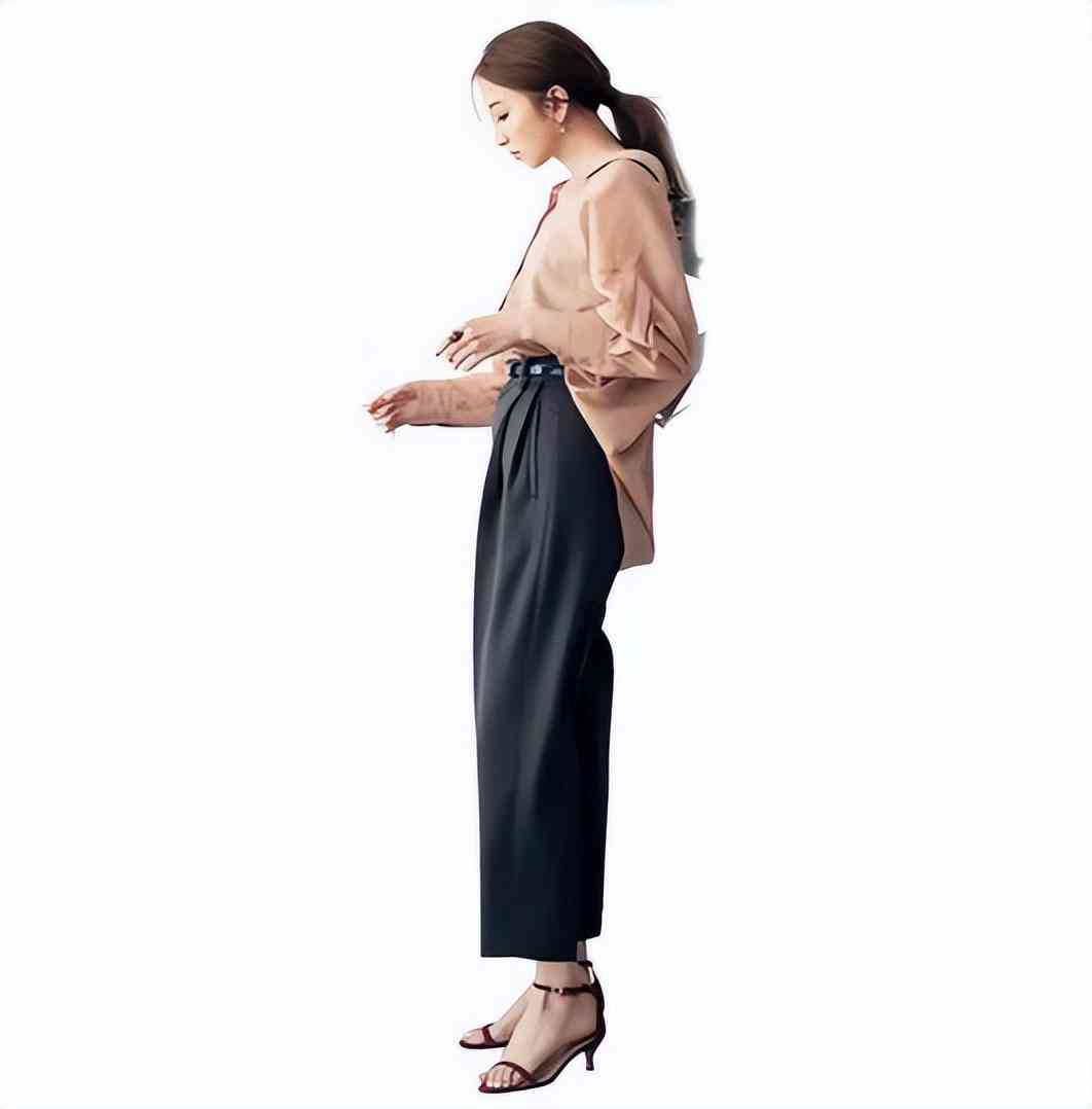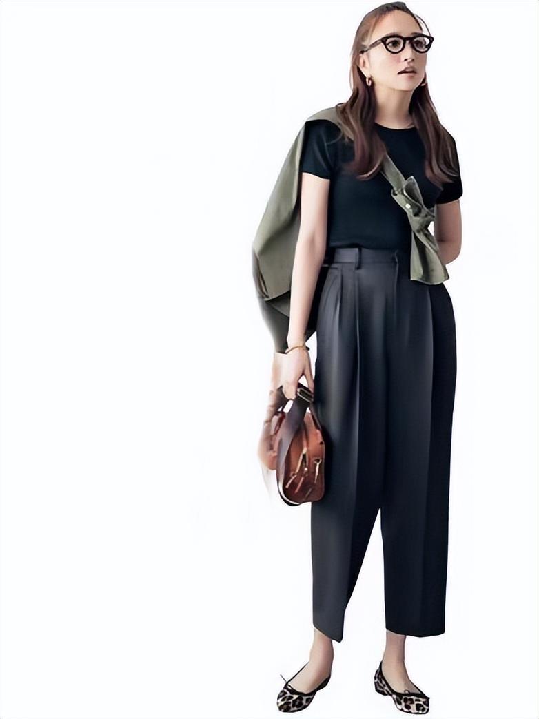 黑色九分褲中,有2個(gè)堪當(dāng)大任。一個(gè)是利落的直筒褲;一個(gè)是灑落的蘿卜褲。上寬下收,腰、腹、大腿有完美的修飾線,對(duì)梨形身材特別友好。