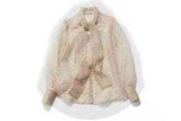非常輕盈的透視材質(zhì),灑滿星星點(diǎn)點(diǎn),浪漫意境勾勒欲出。配合飄逸飄帶,怎么看都是一件甜膩入骨的溫柔襯衫。