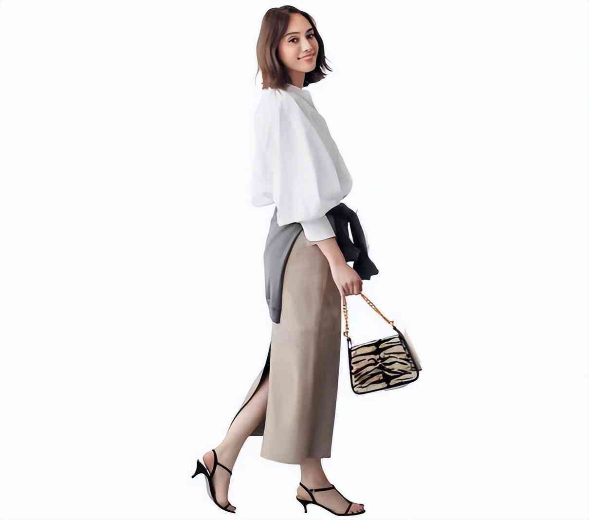 僅是比米色略淺,米白色的百搭功能就強(qiáng)出不少。同樣是剪裁利落的直筒裙,前開(kāi)叉設(shè)計(jì),但招搖夸張的調(diào)性已經(jīng)按捺不住。