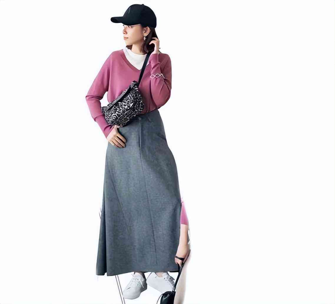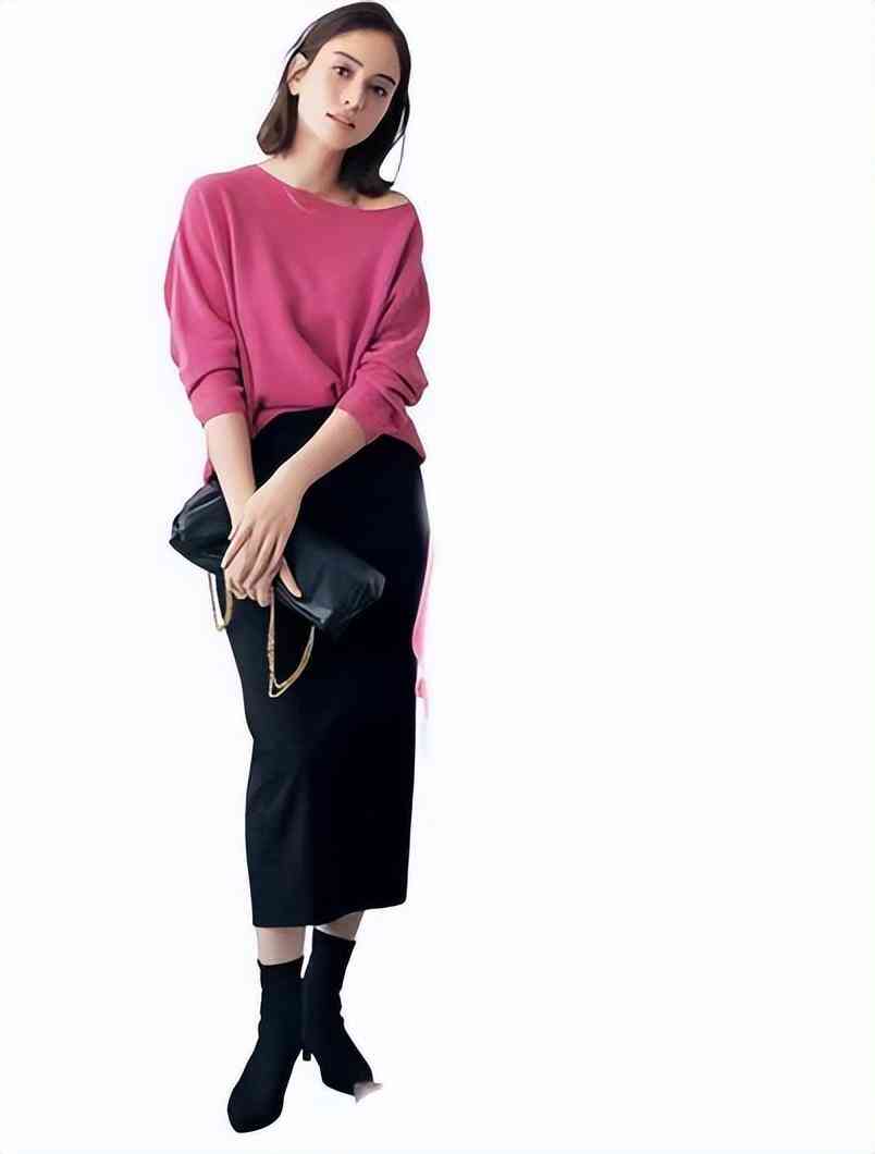 中性風(fēng)如何柔美?下圖搭配正好是示范。黑色直筒半裙,輕薄、柔軟材質(zhì)就是暗藏的女人味。搭配玫紅色,內(nèi)有灰色銜接,分寸拿捏到位。
