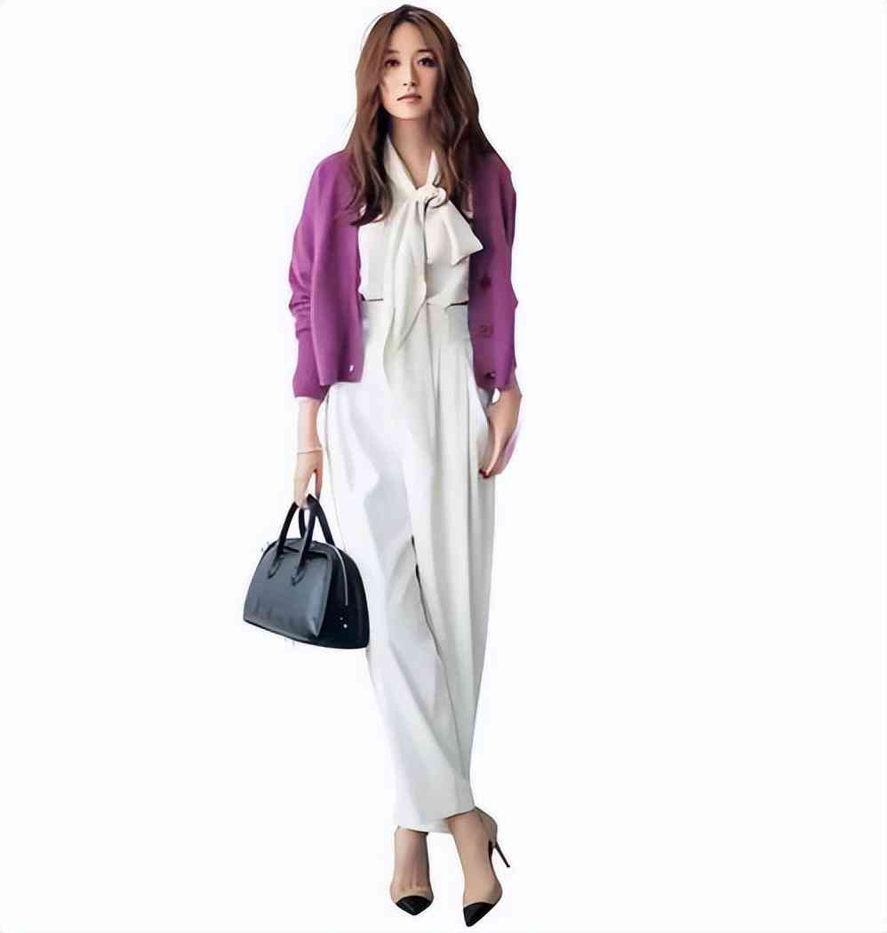 玫紅色開(kāi)衫,內(nèi)搭一身白色,反襯出鮮艷艷的華麗。利落線條傍身,不會(huì)顯得過(guò)分軟弱。搭配尖頭鞋、穩(wěn)重包包,通勤絕佳。