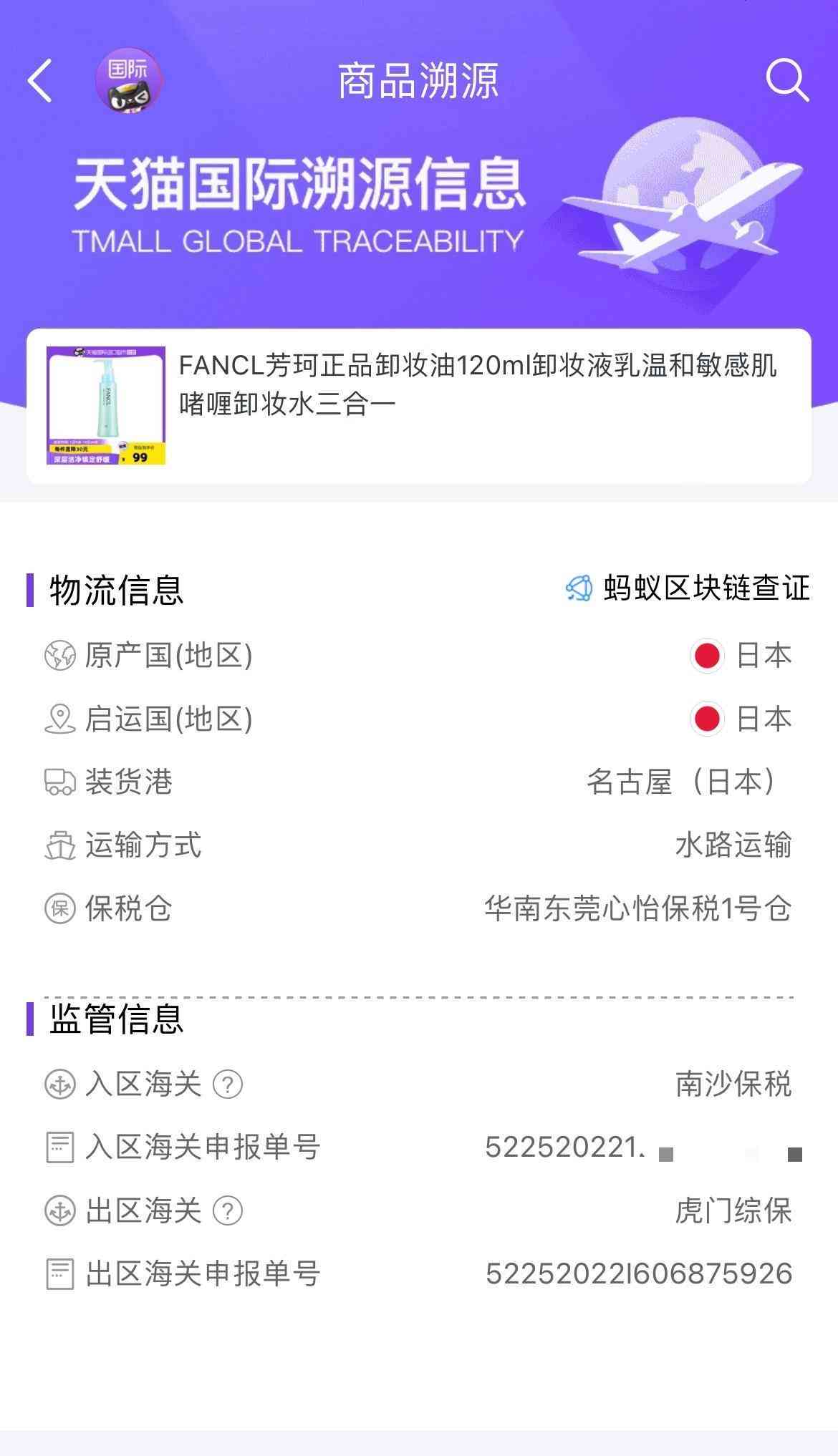 唯品會(huì)顯示在購(gòu)買(mǎi)海淘產(chǎn)品Fancl卸妝油之后,找溯源二維碼、輸入刮開(kāi)可見(jiàn)的六位溯源碼之后,可以看到相關(guān)商品是從新加坡采購(gòu)、并經(jīng)南沙保稅倉(cāng)入境的。
