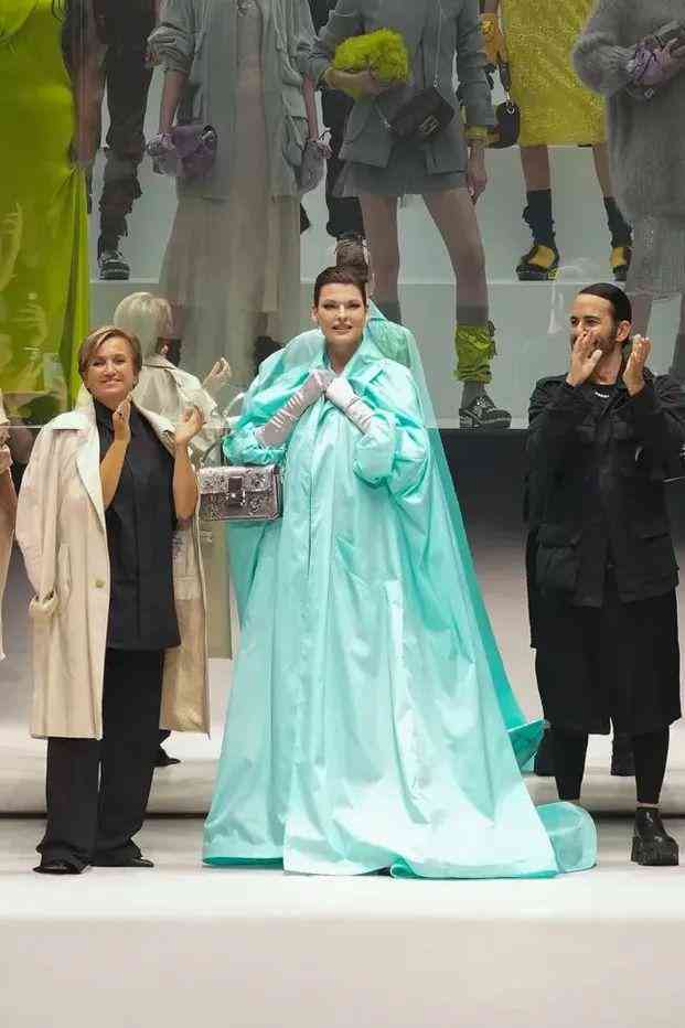 本次大秀最后,由上世紀(jì)走紅的傳奇超模Linda Evangelista壓軸亮相。一身Tiffany藍(lán)夸張斗篷搭配亮片Baguette手袋,以傳奇新生貫連過去到現(xiàn)在的寓意,為本季大秀畫上圓滿句號。