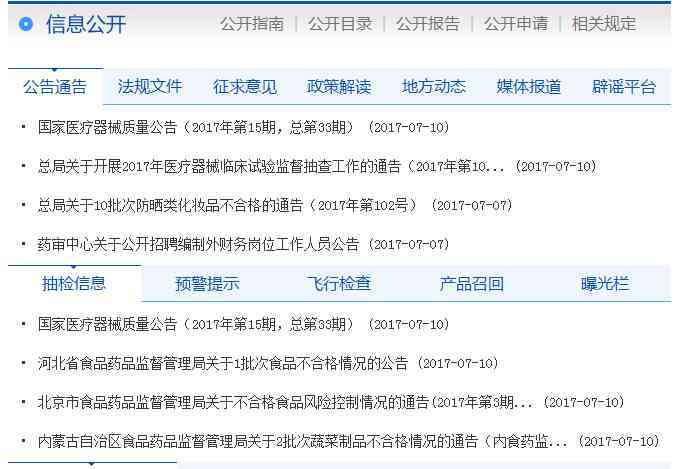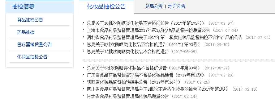 各類監(jiān)督抽檢不合格化妝品信息,請登錄國家食品藥品監(jiān)督管理總局網(wǎng)站(http://www.sda.gov.cn),在信息公開欄目選擇抽檢信息中的化妝品抽檢公告進行查看。