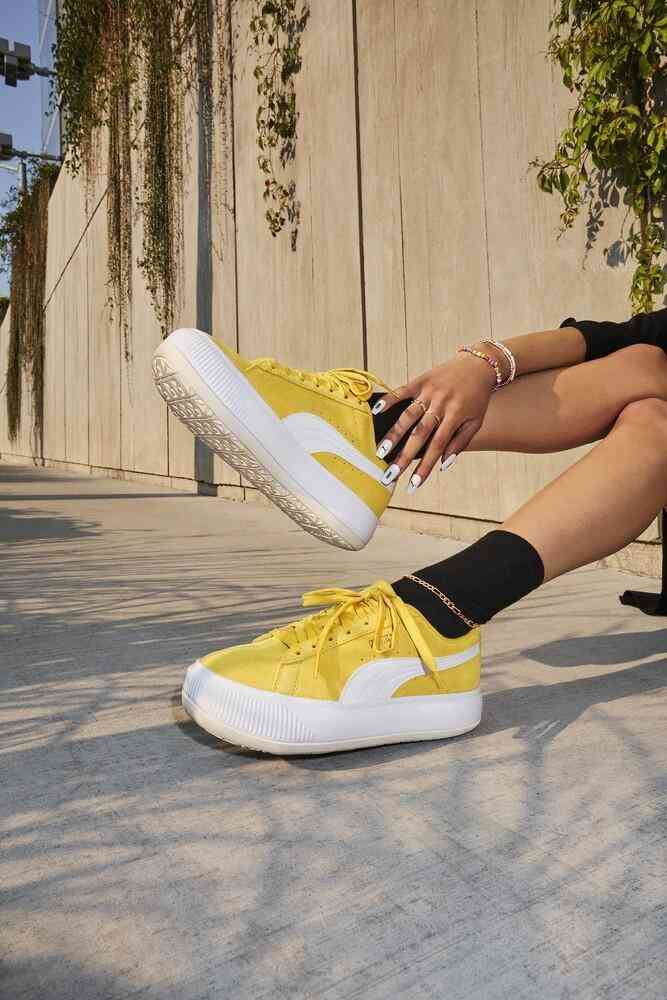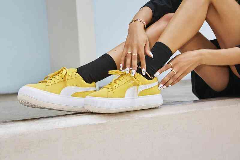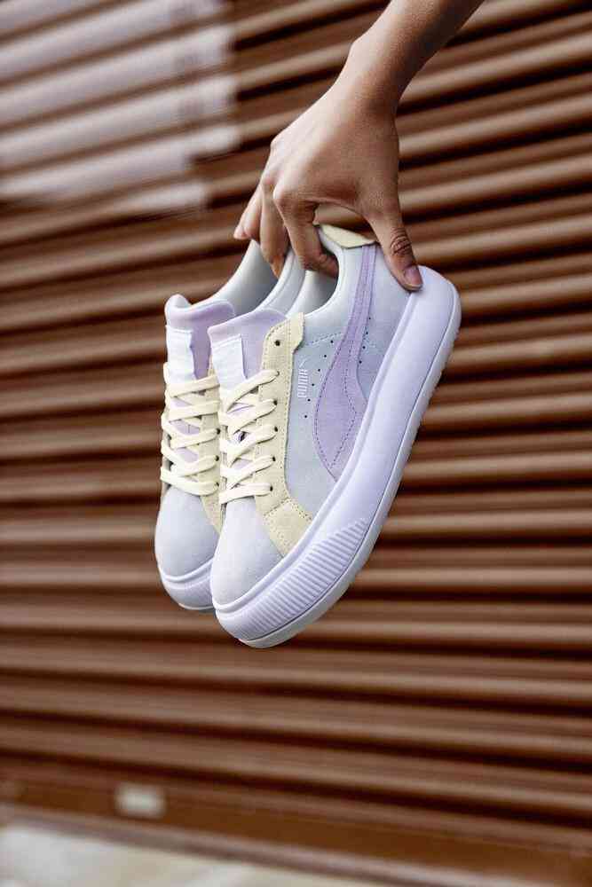 MAYU這個命名取自于日文「繭」的意思。以日文「繭」意思命名的Suede Mayu厚底小白鞋,首度于2021年亮相,Puma于2022春季再推出繽紛配色,運用質(zhì)感麂皮面料包覆鞋面,結(jié)合鮮明的檸檬黃色,另外,Puma還為白色情人節(jié)推出獨角獸限定配色,以鵝黃、淺綠及丁香紫等夢幻馬卡龍色,為Suede Mayu厚底球鞋推出春夏新款。