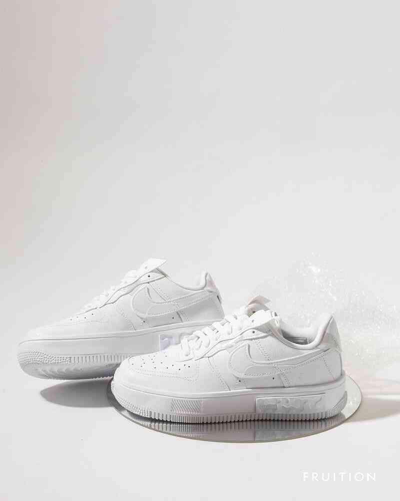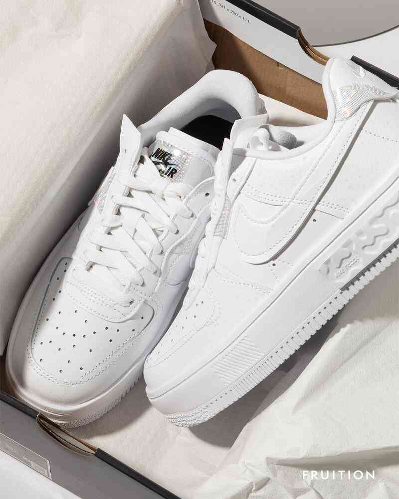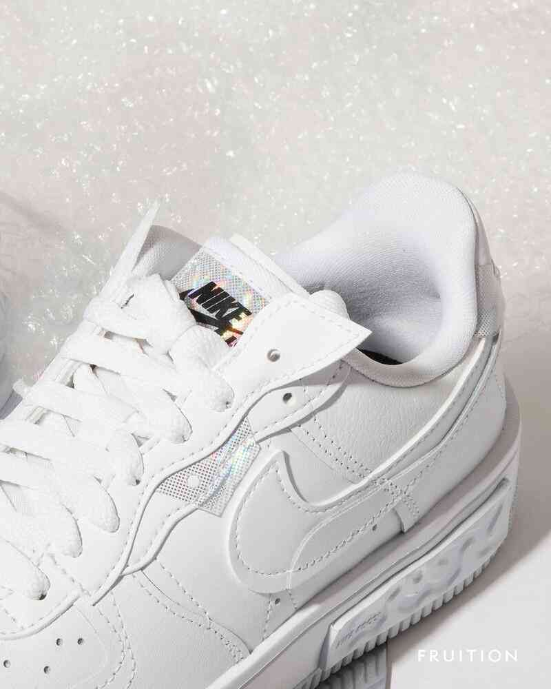 如果覺得粉裸色太少女,F(xiàn)ruition還引進(jìn)全白色霓光款的Air Force1,以蘇聯(lián)解體后的俄羅斯藝術(shù)為靈感設(shè)計,運用全白皮革打造鞋面,搭配加厚中底構(gòu)造,帶來行走時的舒適度,此外,還隱藏宣揚跳舞文化的涵義在其中,從鞋舌、鞋后跟處的反光細(xì)節(jié)便能知道,同時呼應(yīng)上海年輕力中心,夜店Master舞池中燈光交錯閃耀的意象。