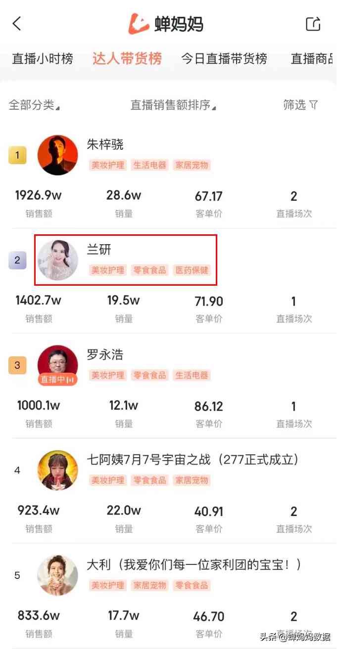 蟬媽媽數據顯示,單是蘭研這一個賬號,近3個月內帶貨銷售額已經超過5300萬,近1年總帶貨額輕松破億。并且蘭研直播間的觀看人數超過500萬,完全不輸明星紅人主播。