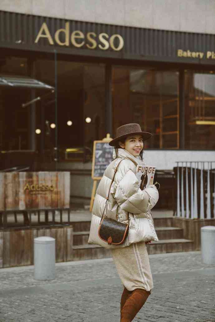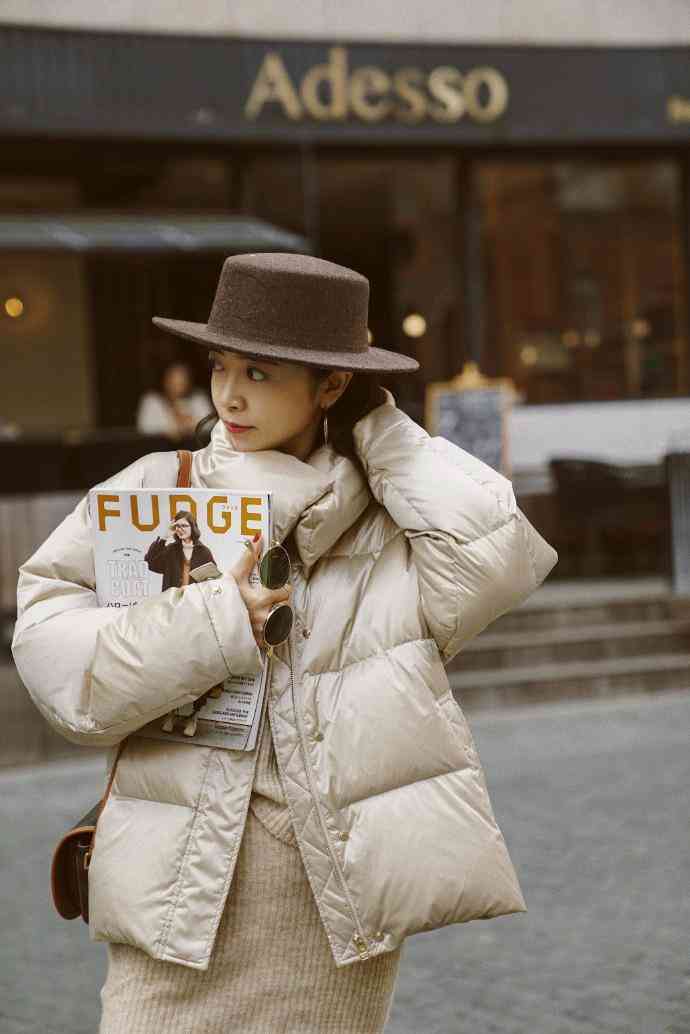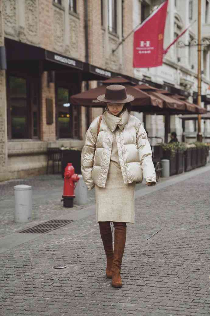 三木的冬日穿搭中有一套H型小款羽絨服搭配米白色針織裙,搭配棕色小禮帽和長(zhǎng)筒靴,可以說是冬日最溫柔的穿搭。小款羽絨服和針織裙的搭配讓身材比例很好地展現(xiàn)了出來,米白和棕色配飾的組合更是冬日溫柔殺。