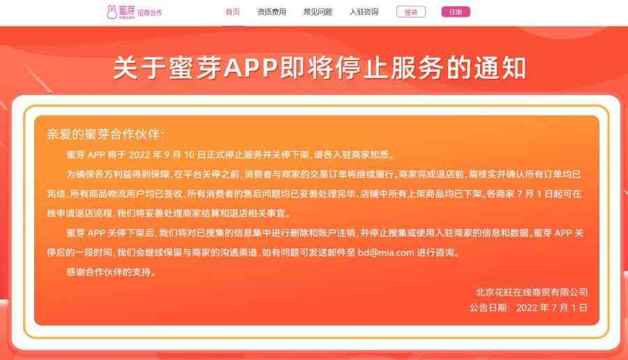 中新網(wǎng)7月5日電 (邵婉云)日前,母嬰電商平臺(tái)蜜芽官網(wǎng)發(fā)布公告,蜜芽APP將于9月10日正式停止服務(wù)并關(guān)停下架。