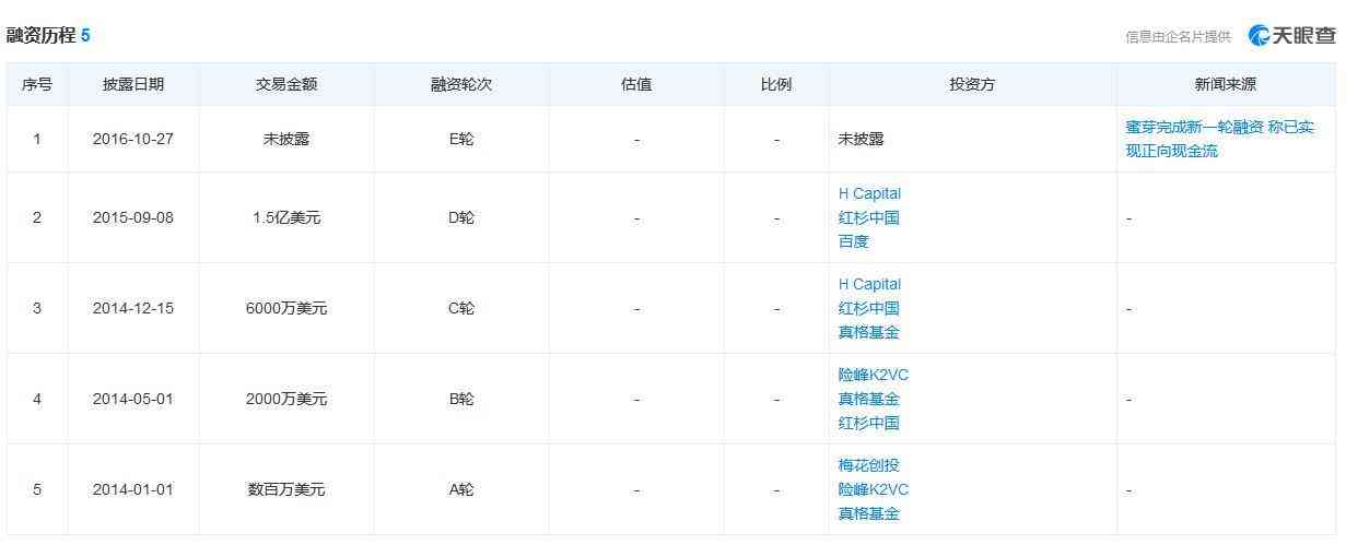 據(jù)天眼查顯示,蜜芽主體公司北京花旺在線商貿(mào)有限公司于2014年完成了三輪融資,每輪融資金額數(shù)百萬至6000萬美元不等。2015年9月完成D輪融資,融資金額1.5億美元。2016年10月蜜芽完成.一輪融資,但融資金額暫未披露。