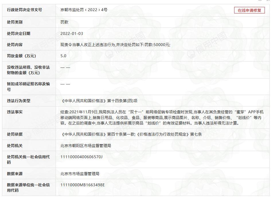 據(jù)信用中國網(wǎng)站顯示,2022年1月3日,北京花旺在線商貿(mào)有限公司被北京市市場監(jiān)督管理局罰款5萬元。