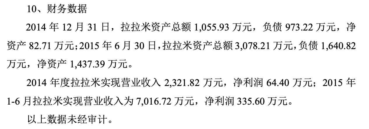 此外,搜于特、潮宏基的對外投資公告還顯示,拉拉米還向兩家公司承諾,經財務規(guī)范后,拉拉米2015年的銷售額將不低于2.5億人民幣,2016年的銷售額將不低于4億人民幣,2017年的銷售額將不低于6億人民幣,并且拉拉米將力爭于2016年下半年實現在新三板公開掛牌并盡力于 2018年正式提交在A股IPO申請。