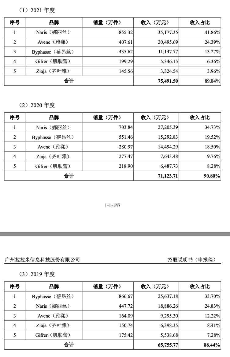 原因之一,拉拉米極度依賴小眾美妝品牌,報告期內,公司孵化的Naris(娜麗絲)、Byphasse(蓓昂絲)、Avene(雅漾)、Ziaja(齊葉雅)、Gifrer(肌膚蕾)五大美妝品牌合計占營業(yè)收入的比重分別為86.44%、90.80%、89.84%,其中娜麗絲功不可沒。