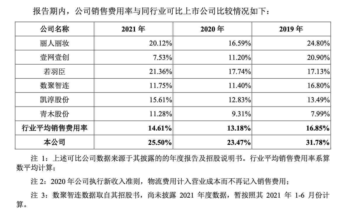 2019年-2021年,拉拉米銷售費用分別為2.42億元、1.84億元和2.14億元,占營業(yè)收入的比重分別為31.78%、23.47%和25.50%,遠超行業(yè)平均水平。其中,僅市場推廣費分別為9283.39萬元、1.05億元和1.26億元,近三年花了3.24億元,主要分為站內的直通車、鉆展、聚劃算、淘寶 客傭金等推廣費和站外的通過小紅書、微博、微信等渠道進行達人推薦、明星代言等。