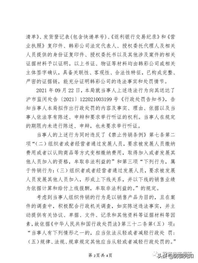 公布的行政處罰書上,顯示處罰主體是上海韓彩貿(mào)易有限公司,法定代表人YANGJANGSUK(梁將錫),經(jīng)查,這個公司的品牌就是伊蓓諾。處罰書載明,由對韓彩公司授權(quán)委托人蔡誠、財務(wù)劉潔、物流經(jīng)理萬紅波和相關(guān)人員制作的詢問筆錄、韓彩公司提供的《辦公室租賃合同》、《情況說明》、公司人員名單、產(chǎn)品外觀照片打印件、《支援金政策、工資政策》、《各級人員發(fā)展結(jié)構(gòu)圖》、《訂單商品詳細(xì)表》和貨款銀行明細(xì)、《團隊支援金工資結(jié)算表》、《產(chǎn)品銷售第 2頁共 4頁清單》、發(fā)貨登記表(包含快遞單號)、《返利銀行交易紀(jì)錄》和《營業(yè)執(zhí)照》復(fù)印件、韓彩公司法定代表人、授權(quán)委托代理人及相關(guān)人員提供的身份證復(fù)印件、授權(quán)委托書以及其他涉及案件的相關(guān)證據(jù)材料予以證明。