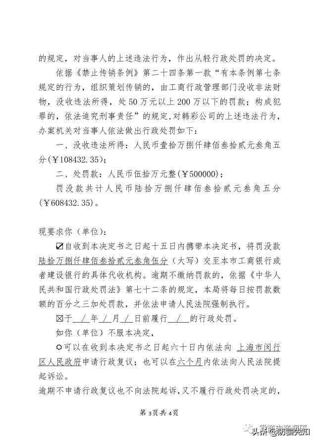 依據(jù)《禁止傳銷條例》第二十四條.款“有本條例第七條規(guī)定的行為,組織策劃傳銷的,由工商行政管理部門沒收非法財物,沒收違法所得,處 50 萬元以上 200 萬以下的罰款;構(gòu)成犯罪的,依法追究刑事責(zé)任”的規(guī)定,對韓彩公司的上述違法行為,辦案機關(guān)對當(dāng)事人依法做出行政處罰如下:
