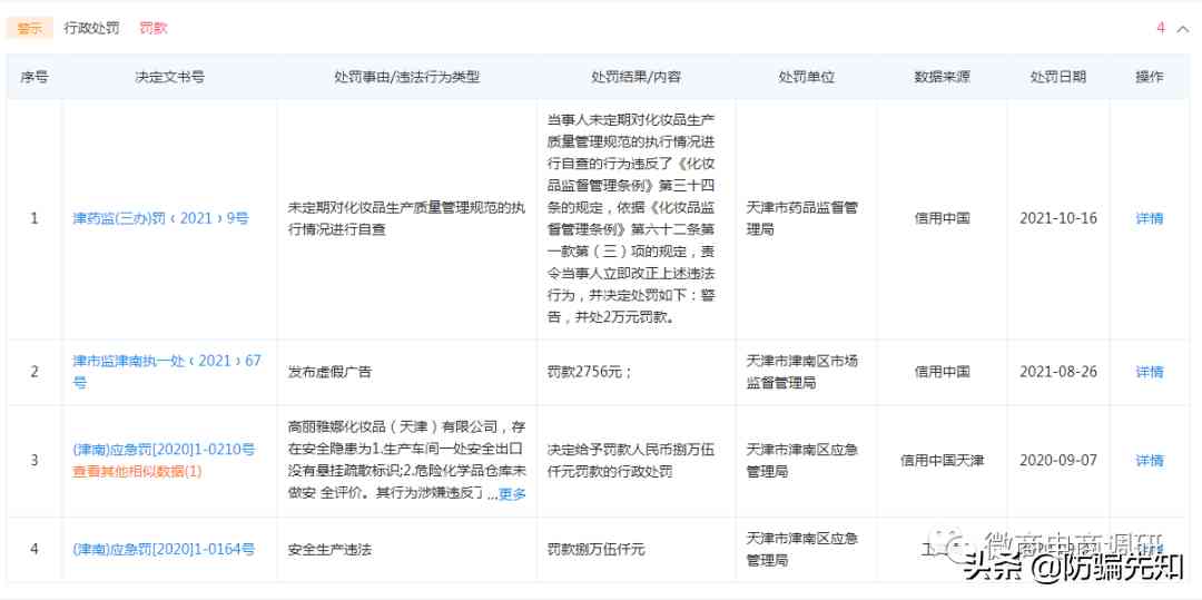 今年10月16日,高麗雅娜化妝品公司因為未定期對化妝品生產(chǎn)質(zhì)量管理規(guī)范的執(zhí)行情況進行自查,違反了《化妝品監(jiān)督管理條例》第三十四條的規(guī)定,依據(jù)《化妝品監(jiān)督管理條例》第六十二條.款第(三)項的規(guī)定,責(zé)令立即改正違法行為,并決定處罰2萬元罰款。今年8月26日因為發(fā)布虛假廣告,被天津市津南區(qū)市場監(jiān)督管理局罰款2756元。去年還因為安全生產(chǎn)違法,被罰款85000元。