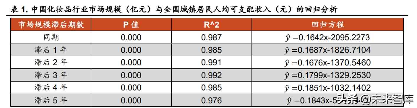 我們認(rèn)為,化妝品行業(yè)規(guī)模提升的本質(zhì)驅(qū)動力來源于全國城鎮(zhèn)居民人均 可支配收入的提升,人均可支配收入的提升會帶動化妝品人均消費(fèi)額的提升。 我們對同期及滯后不同期限的中國化妝品行業(yè)市場規(guī)模與城鎮(zhèn)居民人均可支 配收入進(jìn)行回歸分析,p 值均近似 0.000,小于 0.001,說明結(jié)果顯著。可決 系數(shù) R^2 均大于 0.97,說明回歸關(guān)系可以解釋因變量 97%以上的變異,擬 合優(yōu)度較高。同期的回歸方程為? =0.1642x-2095.2273,表明全國城鎮(zhèn)居民 人均可支配收入每提高 100 元,將帶來近 16.42 億元化妝品市場規(guī)模的擴(kuò)張。 為預(yù)測 2026 年化妝品行業(yè)的市場規(guī)模,我們將 2021 年的城鎮(zhèn)居民可支配收入 47412 元代入回歸方程? =0.1843x-554.2441 中,則預(yù)計(jì) 2026 年中國 化妝品市場規(guī)模約為 8184 億元,與前文所述 Euromonitor 的預(yù)測較為 接近,均超過 8000 億元的規(guī)模。