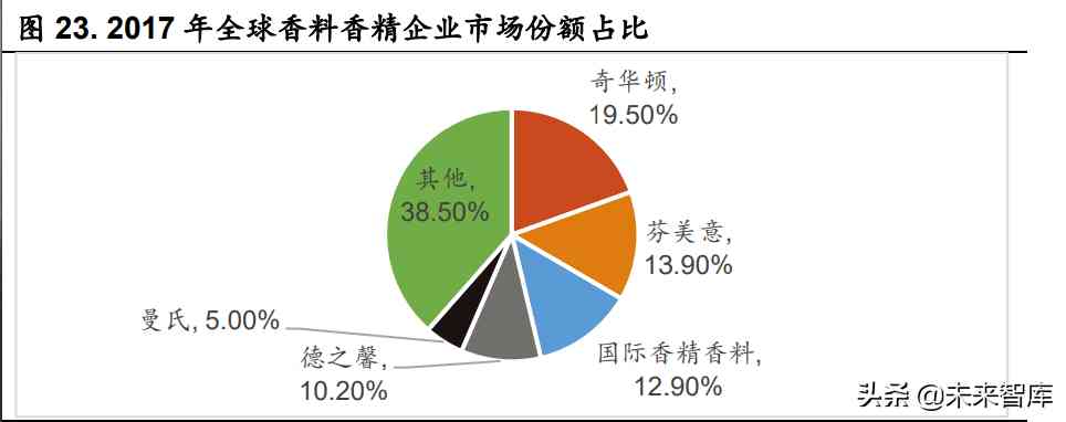 全球香料香精行業(yè)集中度較高,CR5 占比超 60%。全球 CR10 的銷售額 占比由 1999 年的 64.60%提升至 2017 年的 77.20%,行業(yè)集中度穩(wěn)中有升。 其中,全球前五大香料香精企業(yè)主要為歐美廠家,包括奇華頓、芬美意、國 際香料香精、德之馨、曼氏,2017 年市占率分別為 19.5%、13.9%、12.9%、 10.2%、5%,合計(jì) 61.5%。中國本土香料香精企業(yè)以中小企業(yè)為主,2019 年 我國共有香料香精企業(yè) 1000 余家,年銷售額過億的僅 30 余家,占比較低。