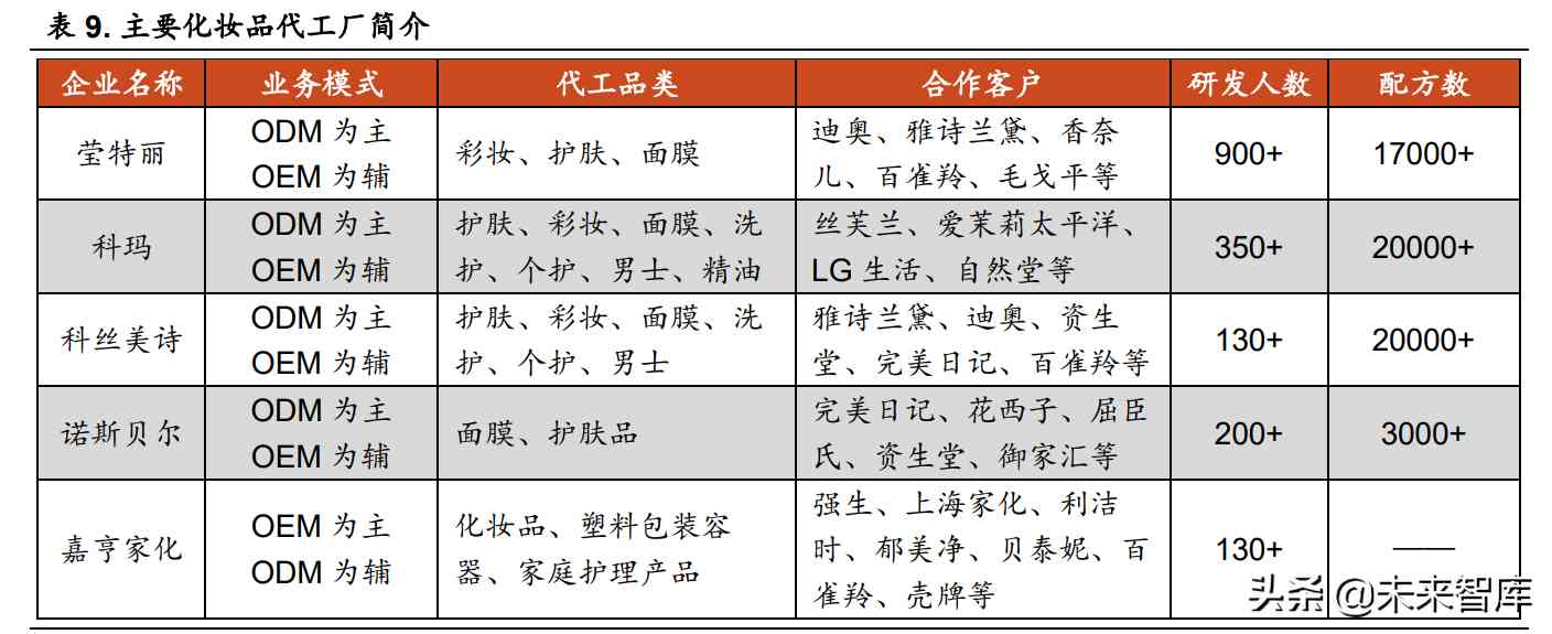 品牌商生產(chǎn)化妝品有自產(chǎn)和代工兩種方式。資金實(shí)力雄厚的成熟品牌出 于配方保護(hù)、品控和規(guī)模效應(yīng)的考量,多以自主生產(chǎn)為主、委托加工為輔, 對代工的需求主要集中于非核心品類、迭代周期較短的彩妝、以及大促期間 的產(chǎn)能補(bǔ)充。新銳品牌通常集中資源用于營銷,在制造端布局較少,通常會 選擇代工完成產(chǎn)品生產(chǎn)。 化妝品代工行業(yè)發(fā)展較為成熟,全球前三的代工廠商包括韓國的科絲美 詩(Cosmax)、意大利的瑩特麗(Intercos Group) 和韓國科瑪(Korea Kolmar) 等。國內(nèi)上市的化妝品代工廠商主要有嘉亨家化和青松股份(本土頭部代工 企業(yè)諾斯貝爾為其子公司)。代工的模式主要分為 OEM 和 ODM,OEM 即貼 牌生產(chǎn),公司按照客戶提供的配方設(shè)計(jì)、工藝控制要求進(jìn)行生產(chǎn),生產(chǎn)技術(shù) 為核心競爭力,ODM 即自主設(shè)計(jì)制造,公司根據(jù)客戶需求開發(fā)產(chǎn)品,產(chǎn)品研 發(fā)、配方設(shè)計(jì)、工藝控制等主要由公司完成,研發(fā)能力為核心競爭力。目前 瑩特麗、科瑪、科絲美詩、諾斯貝爾以 ODM 模式為主,嘉亨家化以 OEM 模 式為主。