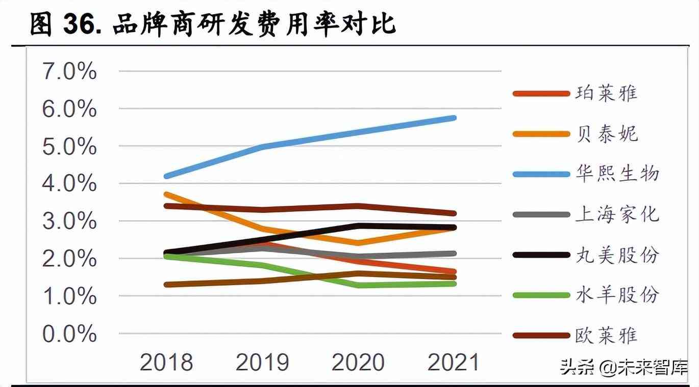 大單品多以有效的核心成分為切入點(diǎn)。誕生于 1982 年的雅詩蘭黛小棕 瓶在礦物油護(hù)膚品時代創(chuàng)新性地添加超 9%二裂酵母提取液,打造細(xì)胞修復(fù)、 夜間修復(fù)的功效賣點(diǎn)和概念,并首次將玻尿酸作為保濕劑。產(chǎn)品還開創(chuàng)式地 采用微乳液配方(半透明外觀、能夠快速吸收的液體配方)、滴管式設(shè)計(jì),創(chuàng) 造了“精華”這一品類。誕生于 2009 年的蘭蔻小黑瓶同樣以二裂酵母作為核 心成分,但通過添加羥乙基哌嗪乙烷磺酸、乙醇促進(jìn)透皮吸收,主打滲透功 效和基因保養(yǎng)概念,品類定位于促進(jìn)肌膚能更好地吸收精華的“肌底液”,差 異化定位使其與小棕瓶等精華品類形成一定的競合關(guān)系。SK-II 神仙水的主 要成分 Pitera 是專利成分,具有幫助調(diào)節(jié)肌膚自然生理作用、舒緩日曬后的 肌膚、補(bǔ)充肌膚水分、調(diào)節(jié)皮脂平衡、光滑肌膚、提亮膚色、調(diào)節(jié)肌膚 PH 值 的護(hù)膚功效,這一成分自 1980 年沿用至今。過硬的產(chǎn)品力根植于研發(fā)端的 基礎(chǔ)研究和配方開發(fā)。2021 年,歐萊雅、雅詩蘭黛的研發(fā)費(fèi)用分別約為 78.58 億元、15.68 億元,研發(fā)費(fèi)用率 3.2%、1.5%。國內(nèi)品牌商研發(fā)費(fèi)用率已與國 際集團(tuán)相當(dāng),但研發(fā)費(fèi)用的投入量級仍有顯著差距。
