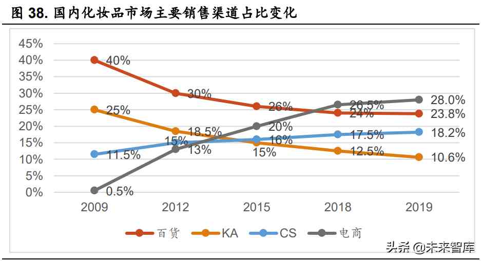 我國化妝品市場經(jīng)歷了幾輪渠道更迭,大致可分為以下幾個階段: (1)百貨及 KA 時代(2000-2009 年):KA 渠道指沃爾瑪、大潤發(fā)等大 型商超,產(chǎn)品主要覆蓋日化用品及大眾美妝產(chǎn)品。百貨渠道品牌檔次高于 KA, 注重消費(fèi)者體驗(yàn),是海外大牌在國內(nèi)的線下主戰(zhàn)場。 (2)CS 渠道紅利(2009-2015 年):CS 為屈臣氏、絲芙蘭、嬌蘭佳人 等化妝品專營店,通常為多品牌加盟代理經(jīng)營。通過布局下沉市場,自然堂、 珀萊雅、韓束、百雀羚等本土品牌隨著 CS 渠道的發(fā)展而快速崛起。 (3)傳統(tǒng)電商紅利(2015-2018 年):電商渠道增長迅速并成為.大 渠道,淘寶、天貓等等傳統(tǒng)電商平臺興起。線上渠道進(jìn)入壁壘低,面膜、精 油等品類與電商渠道契合度高,孵化出了阿芙精油、御泥坊、膜法世家等受 益于電商紅利的“淘品牌”。珀萊雅在該階段也積極抓住線上化趨勢進(jìn)行布局, 銷售額實(shí)現(xiàn)快速增長。 (4)社交電商紅利(2018 年至今):社交電商興起,出現(xiàn)了完美日記、 花西子、橘朵等新銳品牌。