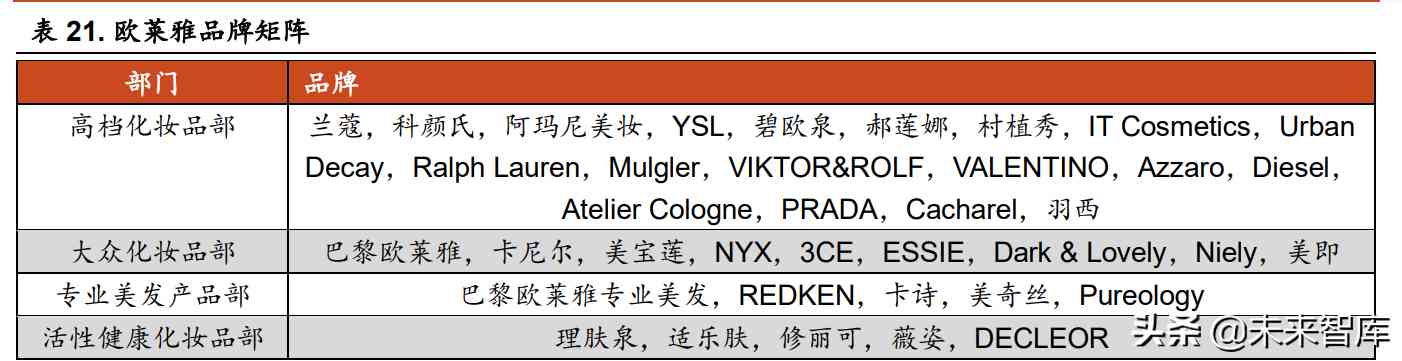 雅詩蘭黛和歐萊雅的品牌矩陣具有以下特征:1)多品類發(fā)展。產(chǎn)品品類 齊全,護(hù)膚、彩妝、香水、護(hù)發(fā)品類均有覆蓋。2)品牌定位完善。高端(La Mer,雅詩蘭黛;郝蓮娜、蘭蔻等)、大眾(MAC、Too Faced;巴黎歐萊雅、 美寶蓮等)、小眾細(xì)分市場(Aerin、La Labo 等)均有覆蓋。