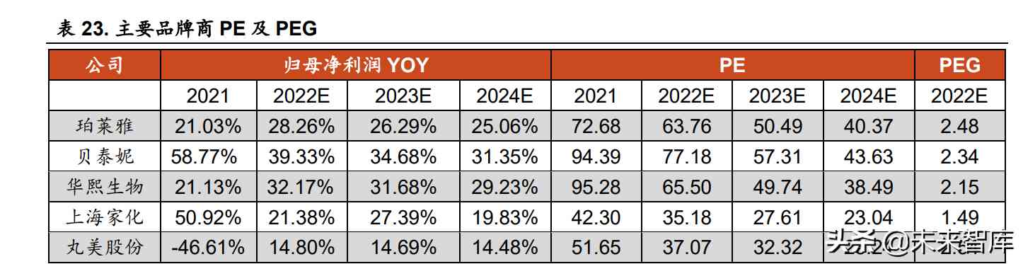 PEG 角度:品牌商 PEG 的區(qū)間范圍為 1.5-2.5X。組織架構(gòu)高效,盈利 能力穩(wěn)定的公司通常 PEG 水平較高,比如珀萊雅。部分景氣細(xì)分賽道擁有 較明顯的研發(fā)壁壘或背書壁壘,代工普及化和營銷多元化背景下,競爭格局 優(yōu)于的傳統(tǒng)化妝品賽道,存在估值溢價,通常 PEG 水平較高。比如貝泰妮所 處的敏感肌護(hù)膚賽道增速高,且顧客復(fù)購率高,皮膚科醫(yī)生背書打造薇諾娜 品牌獨(dú)特的競爭壁壘;華熙生物擁有玻尿酸研發(fā)壁壘,主打“玻尿酸+”護(hù)膚 概念,“成分黨”崛起使其功能性護(hù)膚品業(yè)務(wù)發(fā)展壯大。上海家化除經(jīng)營美容 護(hù)膚產(chǎn)品外,個護(hù)和母嬰產(chǎn)品營收占比也較高,PEG 水平低于化妝品業(yè)務(wù)營 收占比較高的公司。丸美股份過去 2 年歸母凈利潤均同比下滑,PEG 水平不 具備參考價值,PE 估值水平未超過 40-60X 估值上限。