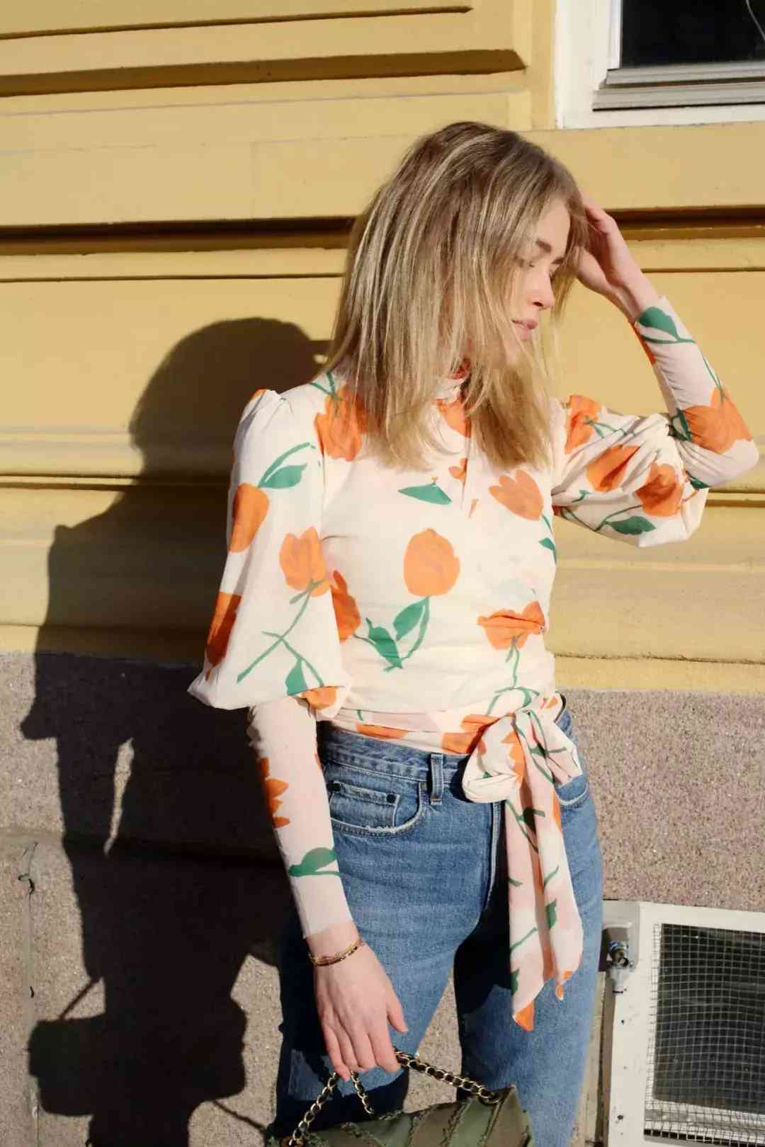 因此,圍裹式上衣天然地將重心放在了腰帶處,系上一個隨手打的結(jié),讓飄帶自然垂下,絲毫不造作,反而別有風情。如果衣服本身帶有印花,那隨之而來的法式chic更有羅曼蒂克之感。至于搭配也非常簡單,高腰褲最顯瘦顯腿長,舍它其誰?