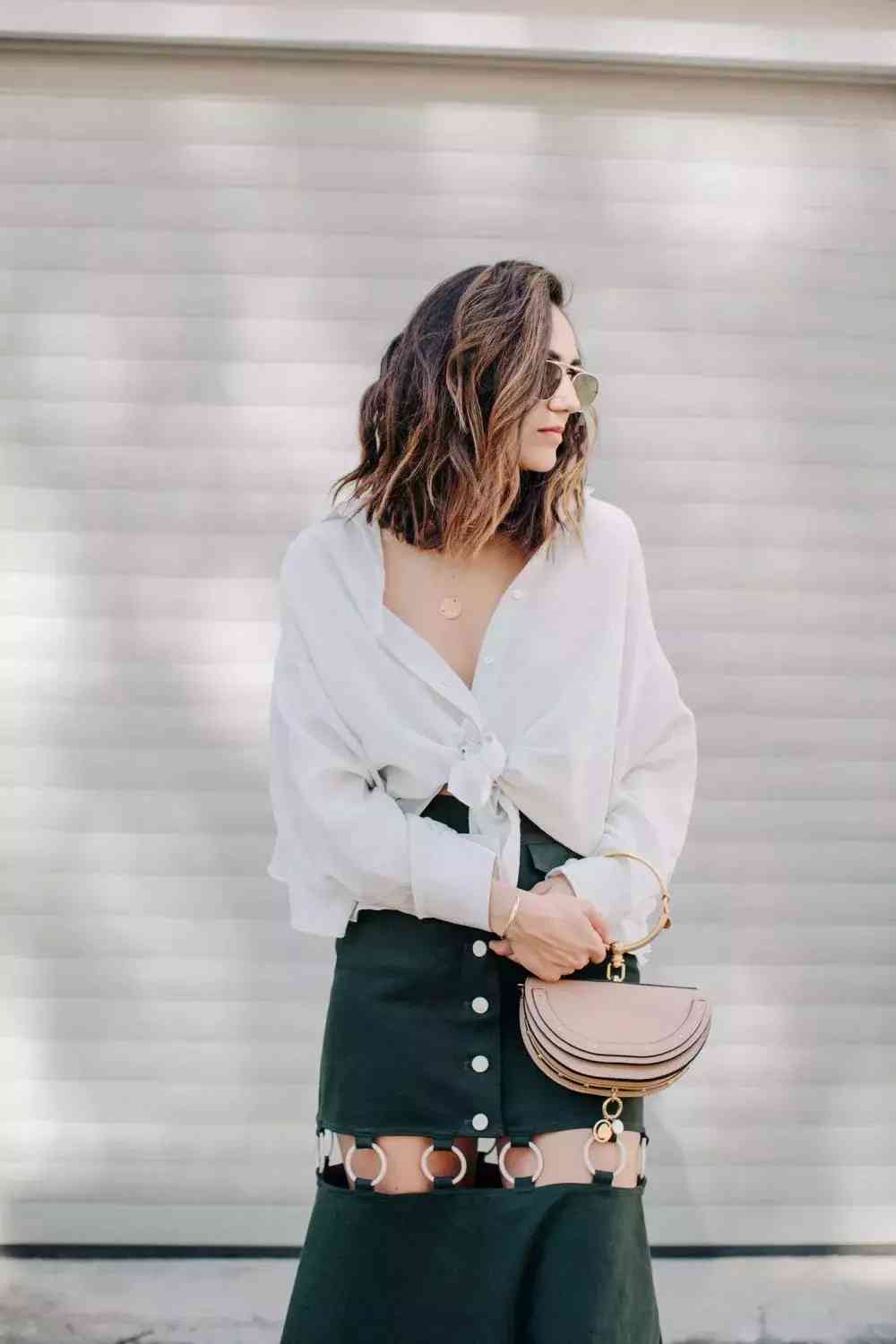 襯衫開一??郏杨I子往后拉一拉,可以打造出襯衫V領的視覺效果。無需打底,直接在下擺打個結(jié)抬高腰線,再搭配一條A字裙,走出門去仿佛有午后陽光灑下來,慵懶而愜意。