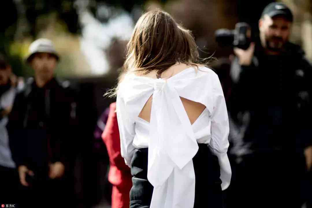 背后打結(jié)的襯衫琳瑯滿目,把小心機悄咪咪地藏在背后,驚喜都在驀然回首之間。這類襯衫打結(jié)太小家子氣和太招搖都不好,將重點放在帶子的“垂感”上最恰當。尤其是背后雙打結(jié)的款式,不一定要打蝴蝶結(jié),兩個活結(jié)搭配裙裝就能簡繁平衡。