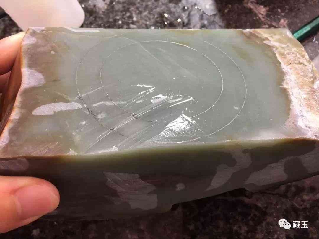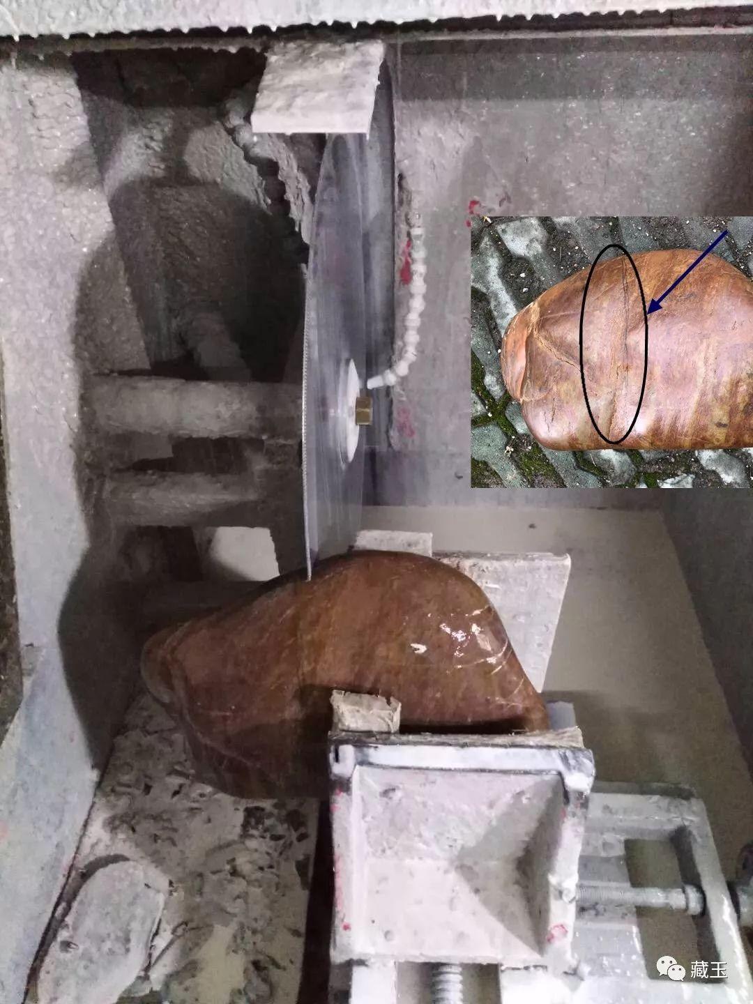 從圖上可以看出,這塊料子雖然厚,但是下半部分竄糖嚴(yán)重,且有裂,所以只能從中間切開(kāi),只留上面這一片玉肉相對(duì)干凈的部分。