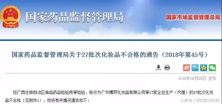 近日,國家藥品監(jiān)督管理局官網(wǎng)發(fā)布《關(guān)于27批次化妝品不合格的通告(2018年第45號)》稱,17家企業(yè)生產(chǎn)(代理)的27批次化妝品不合格!
