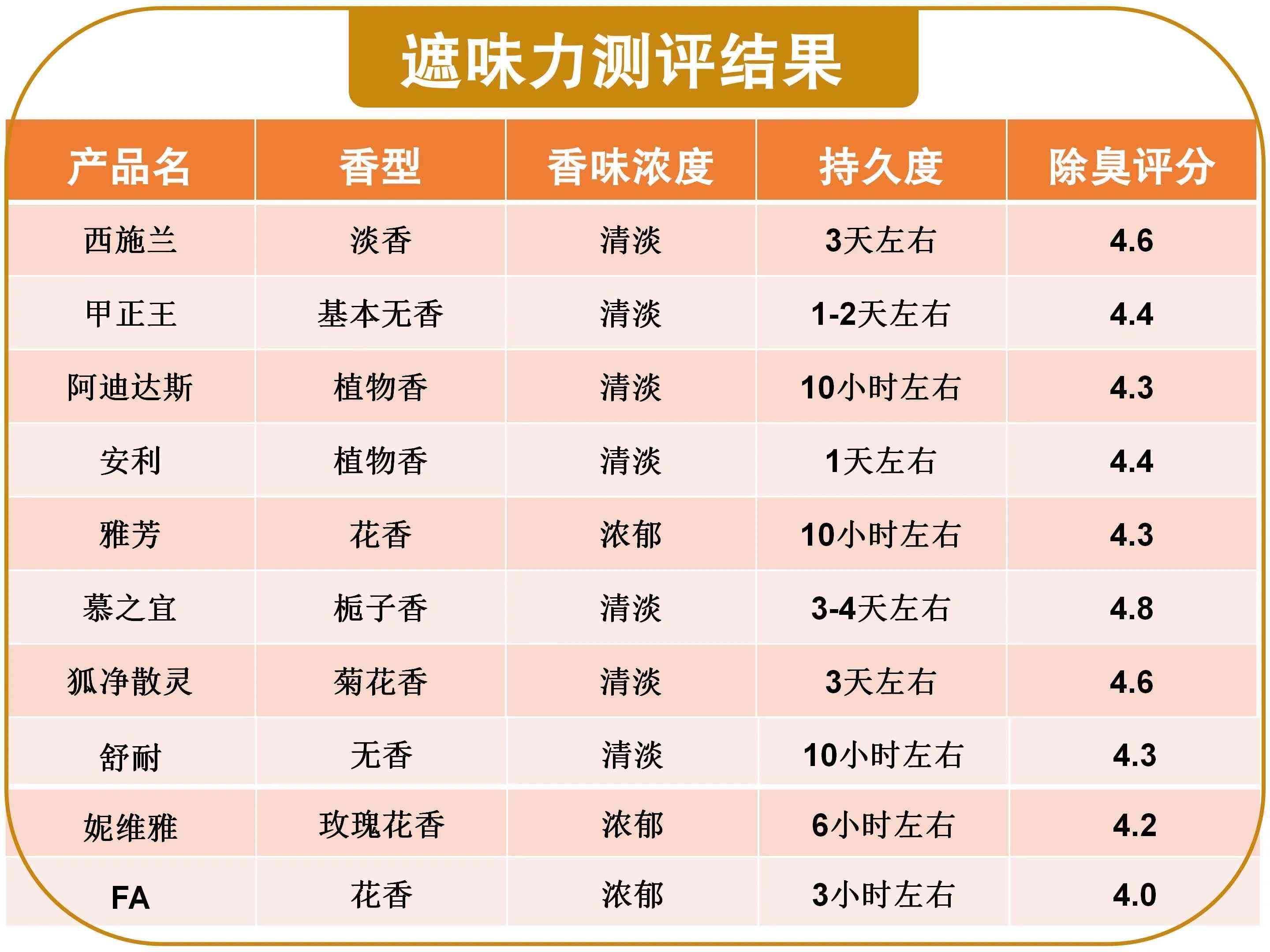 除臭效果排序:慕之宜>西施蘭≥狐凈散靈