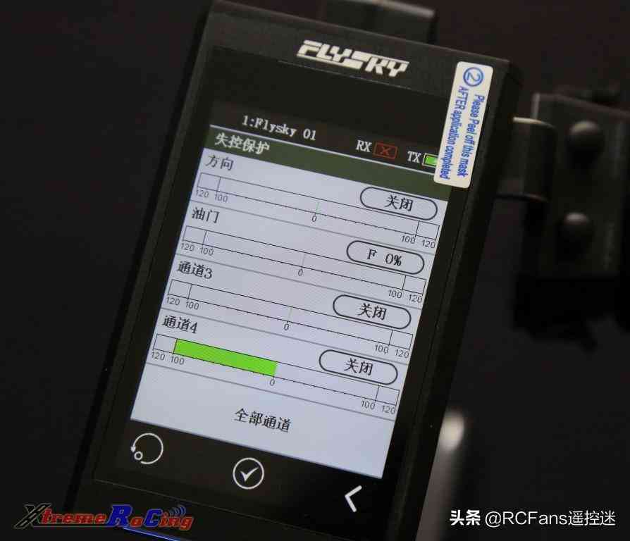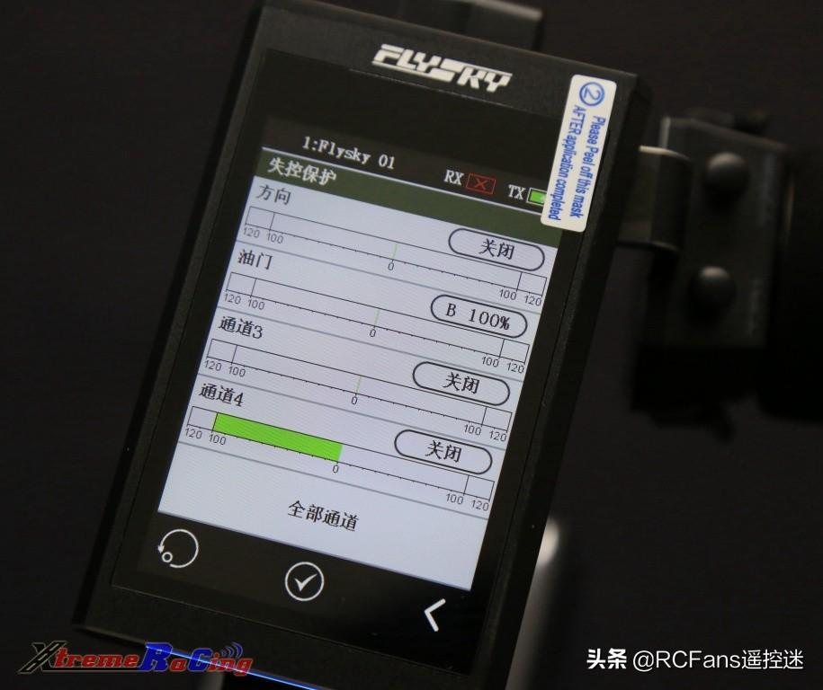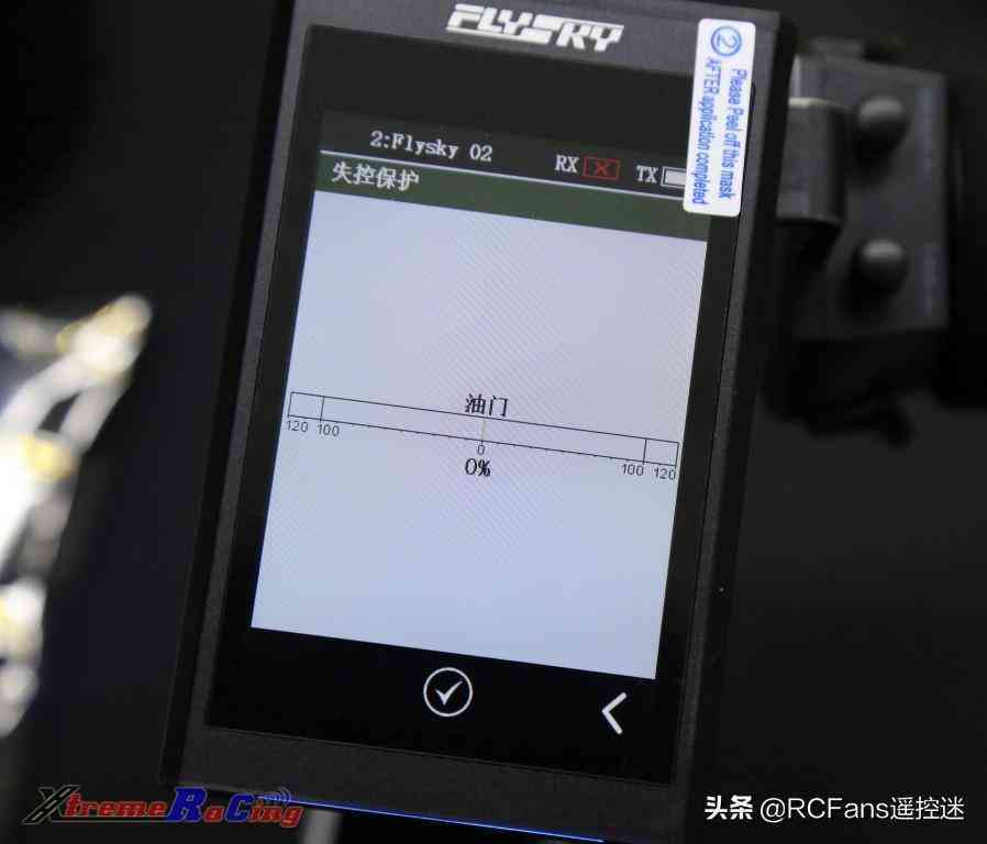 然后在油門失控保護(hù)設(shè)置界面,再次按圖片中央的紅色禁止標(biāo)志,使其變成白色打鉤圖標(biāo),即可開啟了油門通道的失控保護(hù)設(shè)置。